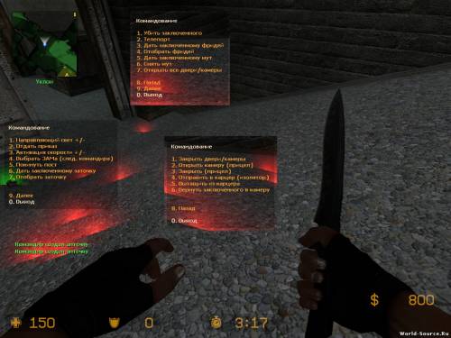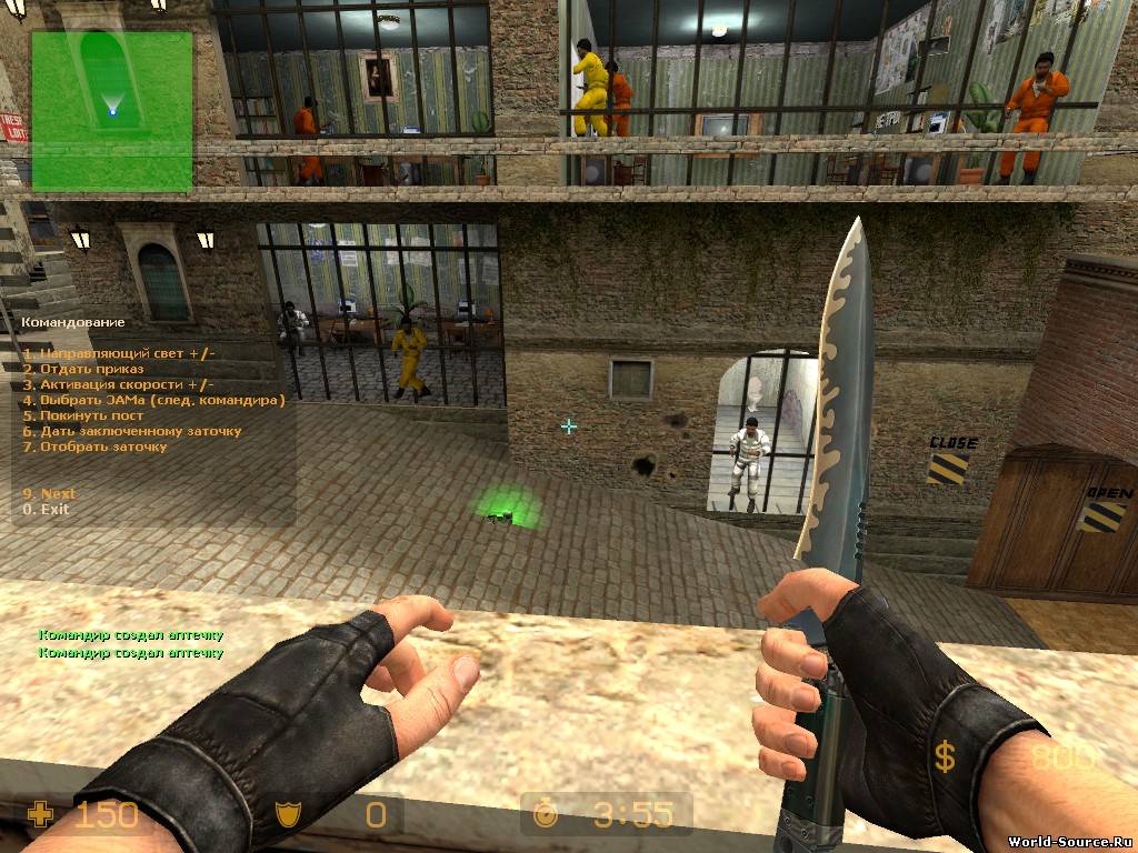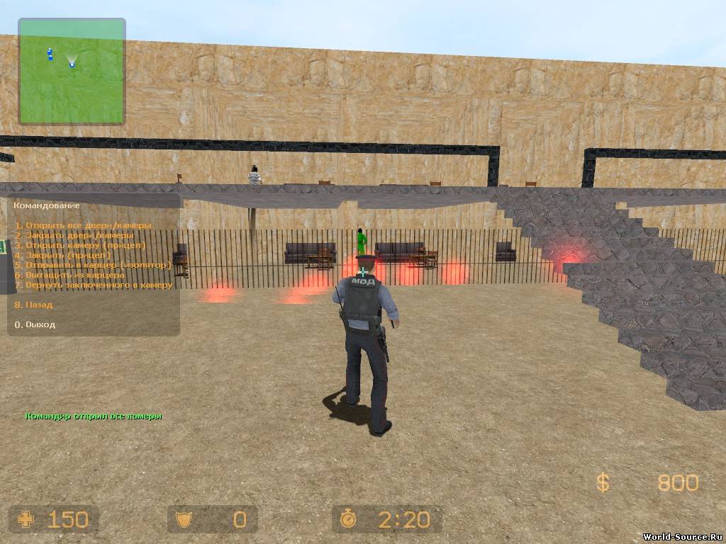 - Направляющий свет +/- - Отдать приказ - Создать аптечку - Активация скорости +/- - Выбрать ЗАМа (след. командира) - Покинуть пост - Дать заключенному заточку (нож) - Отобрать заточку - Убить заключенного - Телепорт - Дать заключенному фридей - Отобрать фридей - Дать заключенному мут - Снять мут - Открыть все двери/камеры (cfg/jail_control/ignore_doors) - Закрыть двери/камеры (cfg/jail_control/ignore_doors) - Открыть камеру (прицел) - Закрыть (прицел) - Отправить в карцер (изолятор) - Вытащить из карцера - Вернуть заключенного в камеру - Вкл/Откл Ноблок - Взять оружие (guns.txt) - Вкл/Откл огонь по своим - Разделение заключенных по цветам