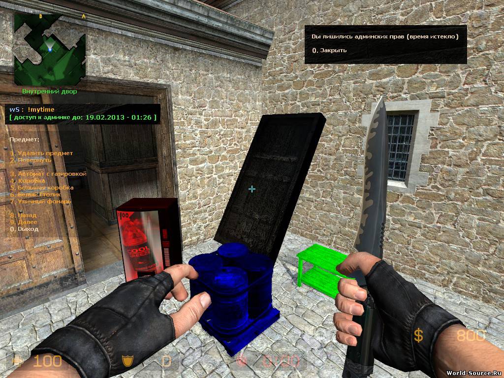 ] admin_add "STEAM_0:0:17233444" 5 wS 'STEAM_0:0:17233444' has been updated (time: 5 min, name: 'wS') ] admin_inf "STEAM_0:0:17233444" 001. 'STEAM_0:0:17233444' -> name: 'wS', access: YES (0:04:57) ] admin_del "STEAM_0:0:17233444" 'STEAM_0:0:17233444' has been deleted ] admin_del "STEAM_0:0:17233444" 'STEAM_0:0:17233444' not found in database