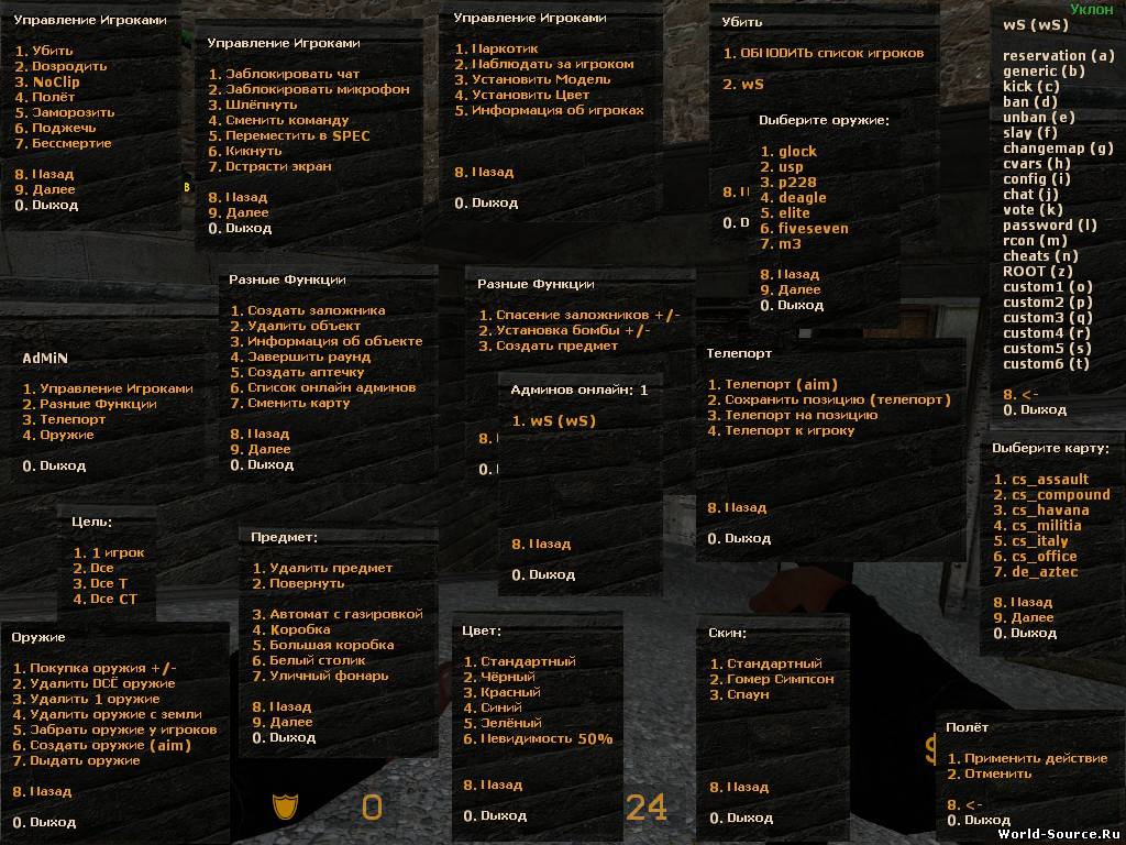 cfg/admin/admin_menu.txt - настройка админ-меню, порядок опций/категорий, текст и флаги доступа cfg/admin/admin.cfg - некоторые дополнительные настройки cfg/admin/kick_reason.txt - причины кика игрока cfg/admin/maps.txt - список карт в админке cfg/admin/skins.txt - скины cfg/admin/downloads.txt - загрузка скинов/звуков и тд cfg/admin/colors.txt - цвета cfg/admin/props.txt - предметы ("physics" "1" значит, что предмет будет подвижным) cfg/admin/weapons.txt - оружие addons/sourcemod/translation/admin.phrases.txt - перевод некоторых фраз addons/sourcemod/scripting/include/ws_admin.inc - функции для использования в отдельных плагинах (скриптинг)
