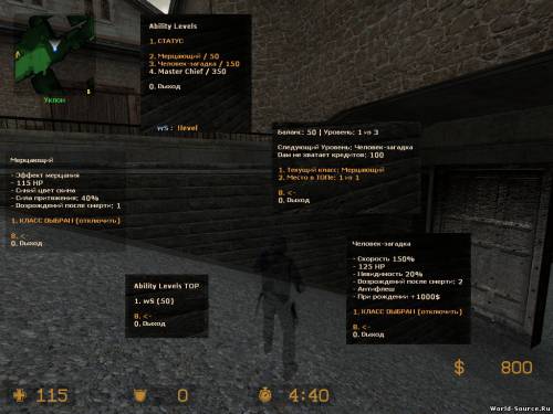 Вы можете создать свои классы/уровни с разными способностями в cfg/ability_levels/levels.txt, которые игроки будут постепенно открывать зарабатывая очки за определенные действия (см. ability_levels.cfg) - это и есть основной смысл плагина. Открыв меню, игрок увидит список всех созданных вами классов, и если он достиг определенного уровня, то сможет выбрать соответствующий класс и играть с его преимуществами. Меню вызывается командами !level, /level в чате, или level в консоле. Классы/уровни в меню расположены в порядке возрастания. Игрок в любой момент может отключить преимущества своего класса и играть стандартно. Уровень и класс - это одно и тоже. Если игрок достиг третьего уровня, то для выбора ему будут доступны и те, которые расположены ниже - это значит, что он сможет выбирать и второй и первый уровень. Необязательно давать классу много способностей, можно просто сделать в стиле Skin Rank со званиями: чем лучше уровень, тем лучше звание и скин и тд.
