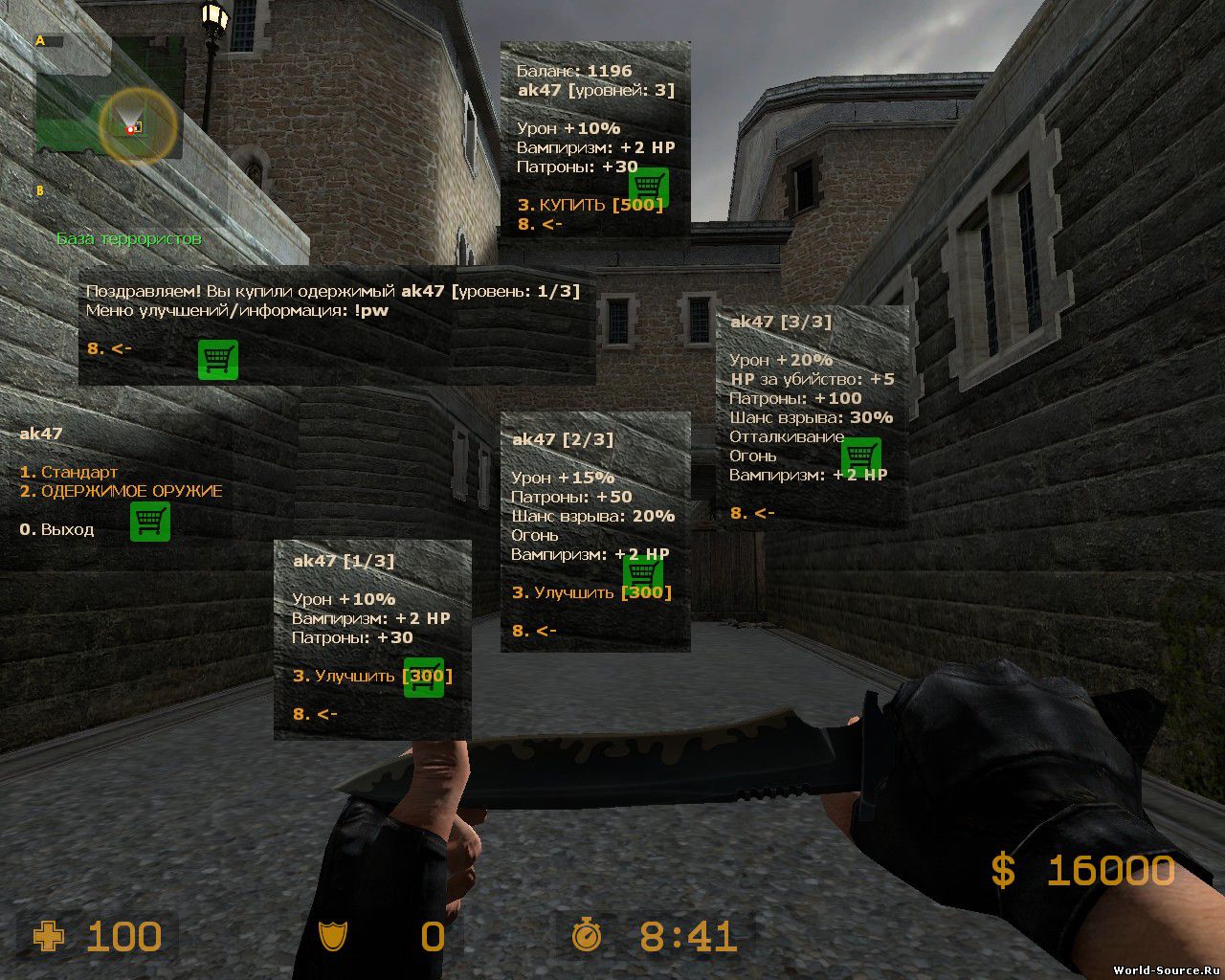 В cfg/possessed_weapons/possessed_weapons.txt вы можете создать одержимое оружие, которое игроки смогут покупать и улучшать. Цены, навыки, уровни оружия - все настраивается. Уровней может быть максимум 5. Каждый новый уровень наследует навыки прошлых. Т.е. если в первом есть вампиризм, то и во втором и в третьем и тд он тоже будет. Почитать разную инфу, купить/улучшить оружие можно через sm_pw меню (!pw, /pw чат) - команду можно изменить в config.cfg. Купленное оружие сохраняется у игрока навсегда (MYSQL, SQLite) - оно будет в его инвентаре. Навыки, которые одержимое оружие дает своему владельцу, работают лишь тогда, когда он держит это оружие в руках (активное) - как только он сменит оружие, они пропадут. Если выбросить одержимое оружие и его подберет кто-то другой - навыки у него работать не будут (если он не покупал это одержимое оружие). Когда игрок меняет оружие на одержимое, экран немного подсвечивается оранжевым цветом (можно это отключить или цвет изменить в настройках). Покупается оружие за кредиты. Чтобы выдать кредиты игроку, используйте эту админскую команду (игрок должен быть онлайн): pw_credits_add "steamid или userid" "credits". Еще есть модуль Credits Giver.